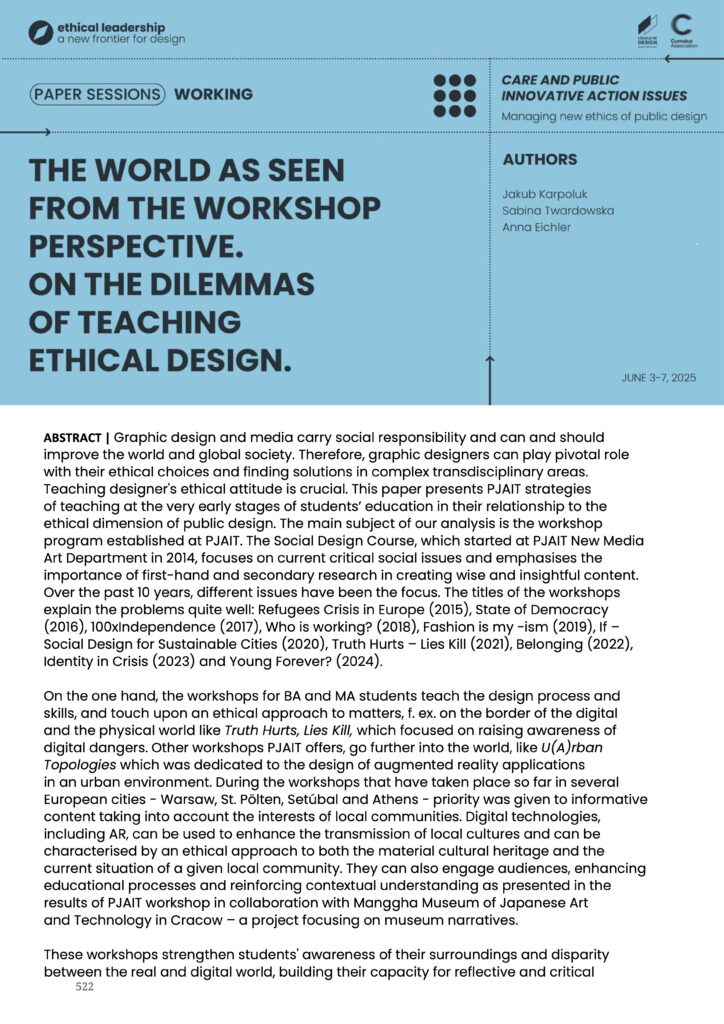 Artykuł podsumowuje przemyślenia i doświadczenia w nauczaniu etycznego projektowania poprzez warsztaty Social Design Course (SDC) oraz projekty z zakresu rzeczywistości rozszerzonej (AR). Autorki i autor podkreślają, że projektanci mają realny wpływ na społeczeństwo, dlatego edukacja etyczna powinna rozpoczynać się jak najwcześniej. SDC, realizowany nieprzerwanie od 2014 roku w ramach programu Wydziału Sztuki Nowych Mediów PJATK, wprowadza studentów pierwszego roku w proces projektowy, badawczy i refleksję nad aktualnymi problemami społecznymi. Każdego roku warsztaty dotyczą innego tematu, m.in. kryzysu uchodźczego, demokracji, dezinformacji, tożsamości czy starzenia się społeczeństwa. Studenci pracują na podstawie artykułów, wykładów ekspertów oraz własnych badań, tworząc ilustracje i animacje o charakterze prospołecznym. Program rozwija świadomość etyczną, krytyczne myślenie i umiejętność pracy zespołowej.