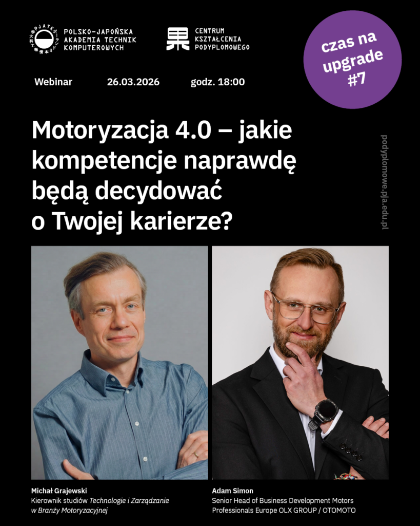 Już 26 marca o godz. 18:00 zapraszamy na kolejny webinar PJATK pt. „Motoryzacja 4.0 – jakie kompetencje naprawdę będą decydować o Twojej karierze?”.