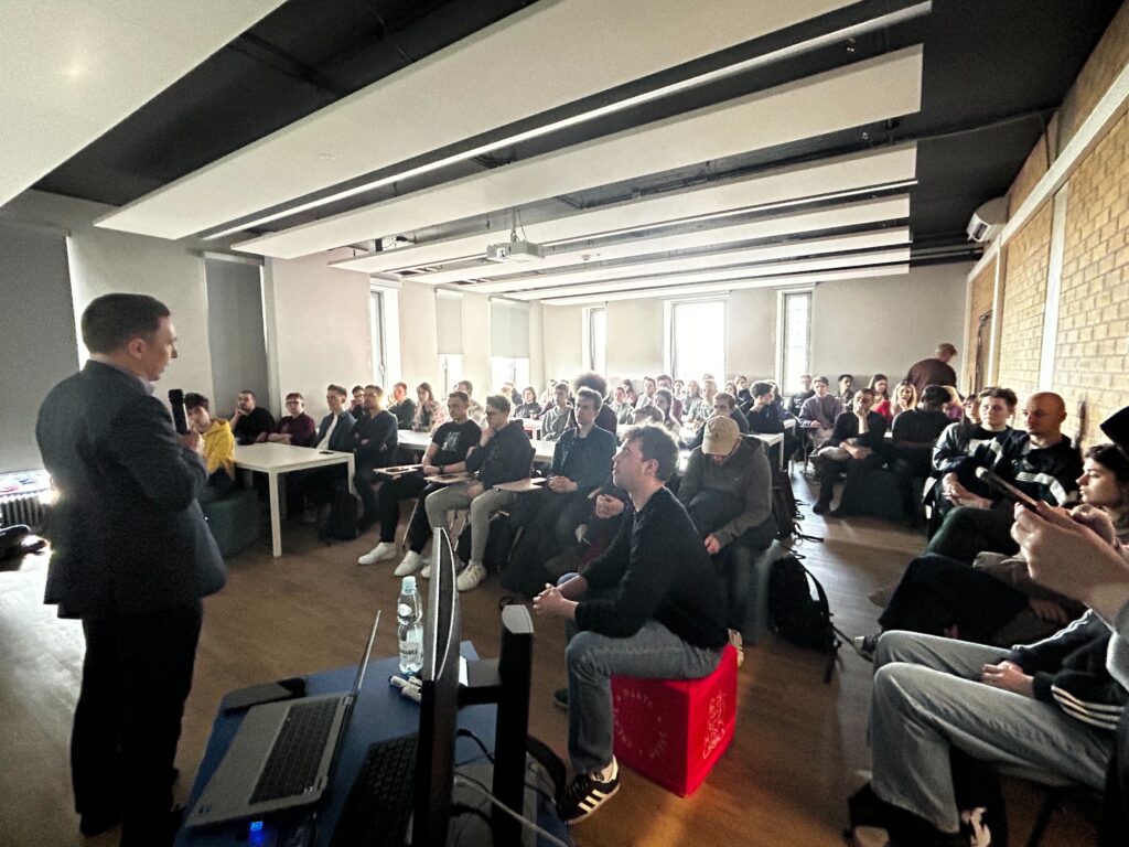 Specjalista przedstawił zebranym fascynującą historię botów. Opowiedział o ich ewolucji i podzielił się głęboką wiedzą na temat systemów, które kierują znanymi nam botami. Następnie rozpoczął interesującą dyskusję o niemal filozoficznym charakterze, zadając pytanie, czy uważamy, że boty są inteligentne i czy działają z intencją? To zagadnienie skłoniło zebranych do refleksji i aktywnej wymiany opinii. Rozmowy trwały nawet po zakończeniu spotkania, a Pan Wojciech Mac odpowiedział jeszcze na wiele pytań zainteresowanych osób. Serdecznie dziękujemy za przekazanie tak dużej dawki wiedzy naszym studentkom i studentom!
