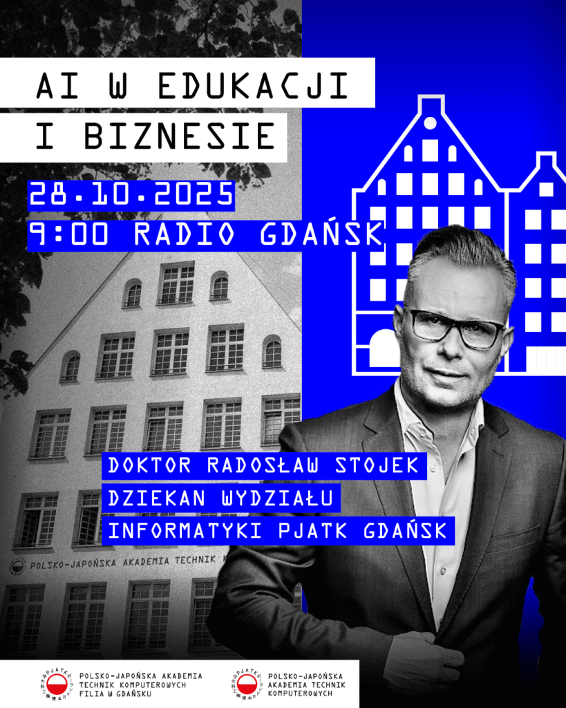Już 28.10.2025 o godzinie 9:00 w audycji „Ludzie i Pieniądze” w Radiu Gdańsk weźmie udział dr Radosław Stojek, Dziekan Wydziału Informatyki PJATK w Gdańsku. Rozmowa będzie dotyczyć sztucznej inteligencji (AI) w edukacji i biznesie.