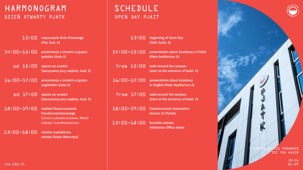 Ponadto podczas Dnia Otwartego obecni będą przedstawiciele Działu Rekrutacji, którzy odpowiedzą na pytania dotyczące tego, jak dostać się na studia w naszej uczelni. Na kandydatki i kandydatów czeka też duża dawka wiedzy o PJATK i spacery po kampusie!