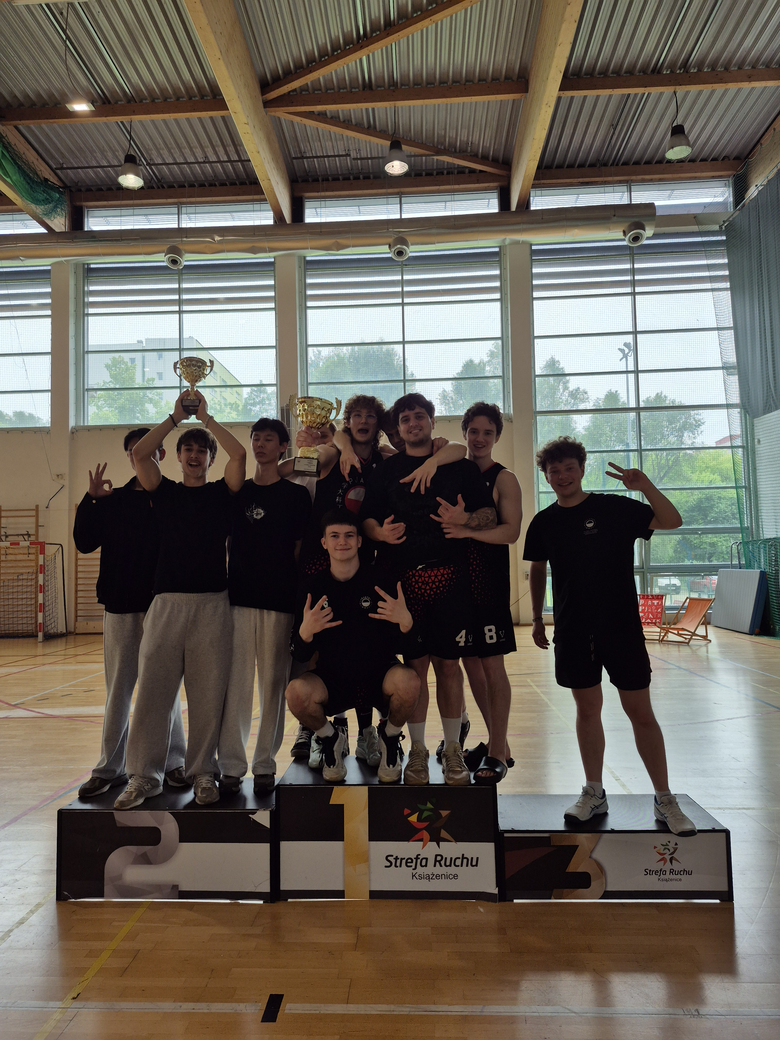 W dniu 8 czerwca 2025 roku odbył się Dzień Sportu – międzyuczelniane wydarzenie integrujące studentów i absolwentów trzech uczelni: Polsko-Japońskiej Akademii Technik Komputerowych (PJATK), Akademii Techniczno-Artystycznej (ATA) oraz Uniwersytetu SWPS. Inicjatywa miała na celu promowanie aktywności fizycznej, zdrowego stylu życia oraz wzmacnianie więzi społeczności akademickiej. Wydarzenie odbywało się na terenie Liceum im. Ignacego Domeyki przy ul. Staffa 3/5 w Warszawie. Już od godziny 11:00 na miejscu obecnych było kilkadziesiąt osób, a frekwencja w ciągu dnia sięgnęła około 150 uczestników. Duża część z nich pozostała na miejscu aż do zakończenia wydarzenia. Największą grupę stanowili studenci PJATK. Dzień Sportu został zorganizowany w bardzo dobrych warunkach infrastrukturalnych – uczestnicy mieli do dyspozycji halę sportową o powierzchni 1400 m² oraz dwa boiska zewnętrzne: do piłki nożnej i siatkówki. Na terenie wydarzenia rozstawiono również leżaki z logo PJATK, które zapewniały wygodę, a jednocześnie promowały uczelnię. Przez cały czas dostępne były bezpłatne przekąski i woda, a na czas meczu pokazowego zamówiono dla uczestników pizzę, którą mogli spożywać w trakcie oglądania spotkania. W programie wydarzenia znalazły się różnorodne aktywności sportowe. Zorganizowano turnieje w piłkę nożną, koszykówkę, siatkówkę oraz tenisa stołowego. We wszystkich tych dyscyplinach rywalizowano o puchary za miejsca I–III. Dla zwycięzców przygotowano specjalne podium do zdjęć, co umożliwiło symboliczne uhonorowanie zaangażowania uczestników. Odbył się także mecz w Ultimate frisbee – dyscyplinie, która zyskała dużą sympatię wśród uczestników i dodała wydarzeniu dynamiki oraz mniej formalnego, integracyjnego charakteru.
