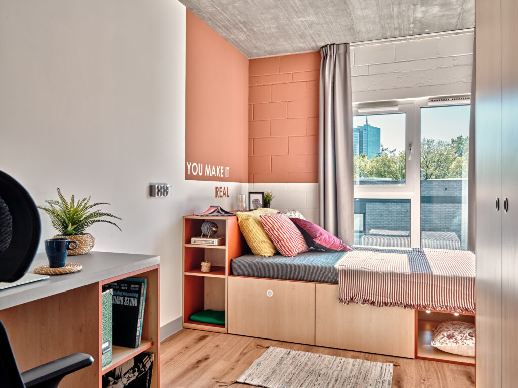 - atrakcyjne strefy wspólne takie jak strefa coworkingowa do wspólnego spędzania czasu i nauki, a także sale chilloutowe i multimedialne oraz wspólną kuchnię i siłownie (w nowym obiekcie Wilanowska);