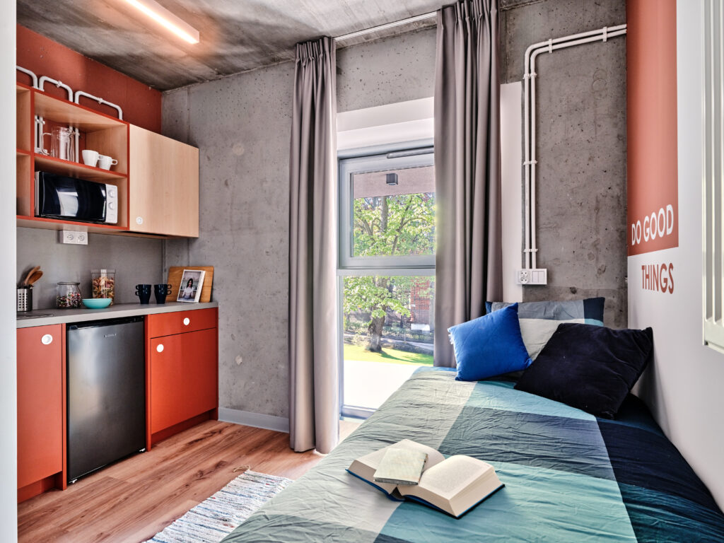 Akademiki oferują miejsca w jednoosobowych mieszkaniach typu studio. Dostępnych jest również kilka pokoi dwuosobowych. Wszystkie pokoje mają wysoki standard, są w pełni umeblowane, posiadają prywatne łazienki z prysznicem i aneksy kuchenne.
