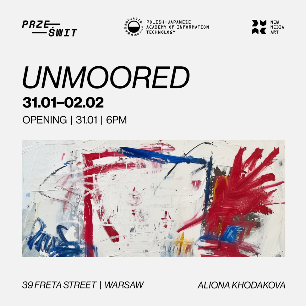 Serdecznie zapraszamy na otwarcie wystawy Unmoored, które odbędzie się 31 stycznia o godzinie 18:00 w Warszawie, przy ul. Freta 33. Wystawa ukazuje dzieła stworzone przez studentkę Wydziału Sztuki Nowych Mediów PJATK, Alionę Khodakową.