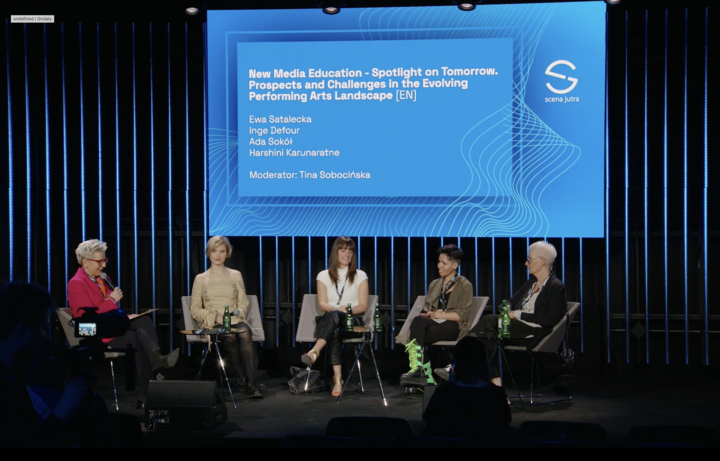 PJATK na Scenie Jutra zaprezentował się również artystycznie. Dr hab. Anna Klimczak i inż. Tomasz Miśkiewicz, wykładowcy Wydziału SNM PJATK opowiedzieli o środowisku TouchDesigner i uczeniu programowania multimediów. Następnie Daria Prasolova i Maria Sidorova, studentki Wydziału SNM, zaprezentowały studencki performance pt. „Interaction In /Out Of Real/ Time” stworzony pod czujnym okiem ww. prelegentów, Sefy Sagira i Bartosza Wyszyńskiego, będący efektem warsztatów Interactive Week 2024 prowadzonych w naszej uczelni. Ich celem było kreowanie etiud wizualnych tworzonych w czasie rzeczywistym, dzięki interakcji danych cyfrowych z dynamicznym ruchem performera.