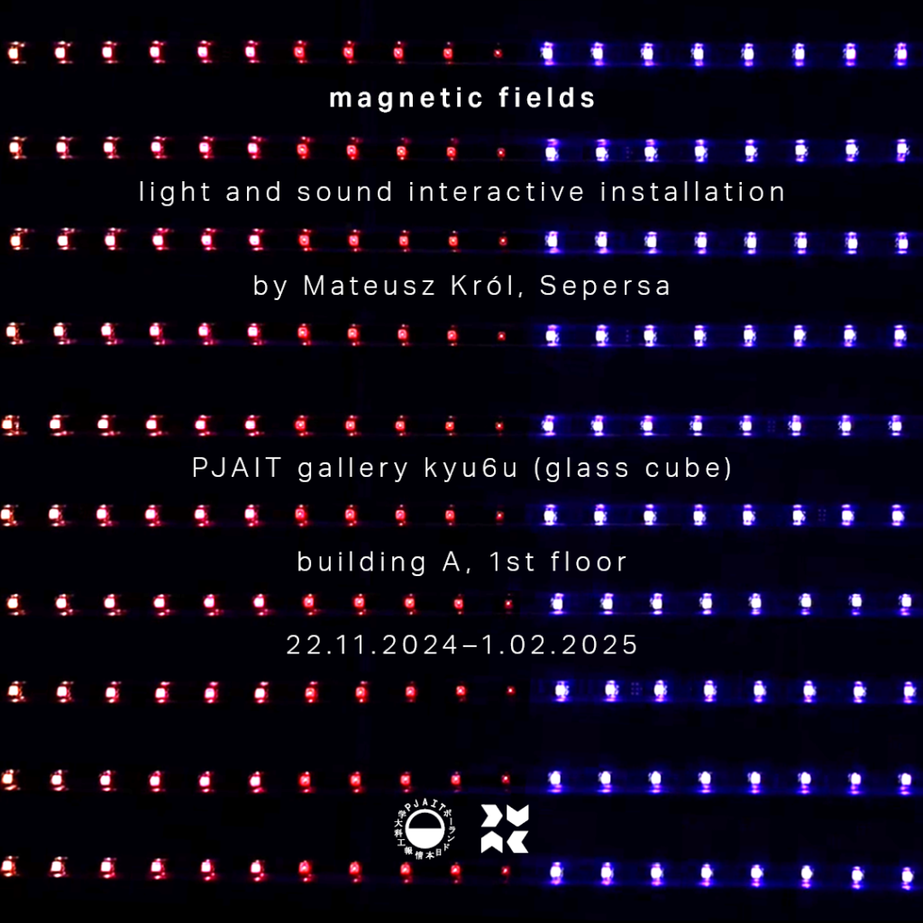 Już od piątku, 22 listopada, od godziny 12:00, serdecznie zapraszamy do podziwiania interaktywnej instalacji audiowizualnej „Magnetic Fields”. Wystawę będzie można oglądać przez trzy miesiące w przestrzeni kyu6u, mieszczącej się w Polsko-Japońskiej Akademii Technik Komputerowych przy ul. Koszykowej 86.