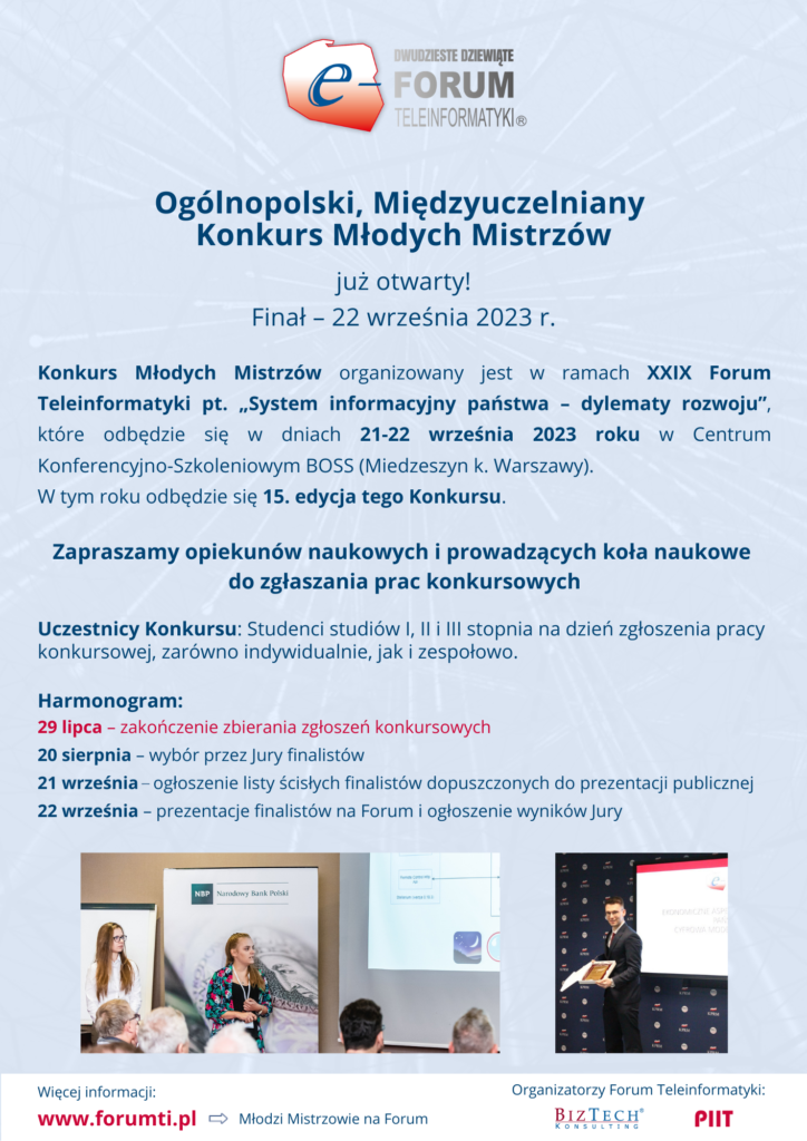 Serdecznie zachęcamy wszystkich studentów do udziału w XV edycji Ogólnopolskiego Międzyuczelnianego Konkursu Młodych Mistrzów, organizowanego przez Radę Programową XXIX Forum Teleinformatyki.