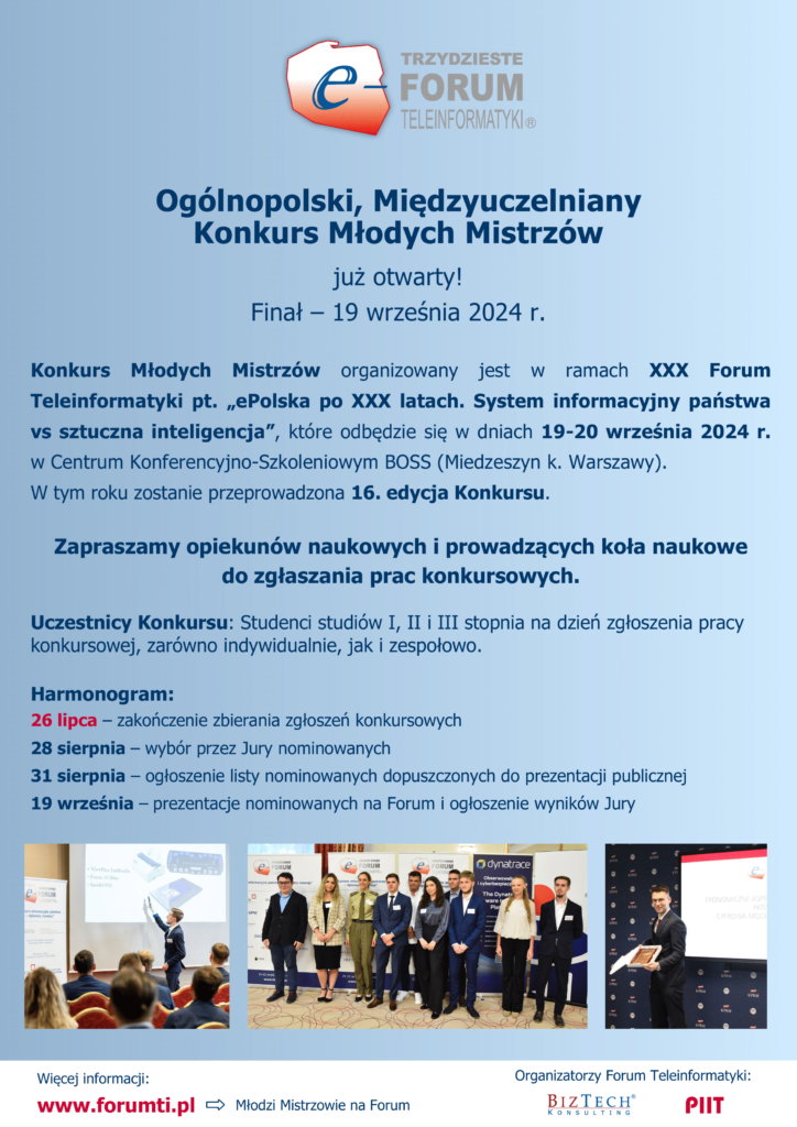 Ogólnopolski, Międzyuczelniany Konkurs Młodych Mistrzów organizowany przez Radę Programową Forum Teleinformatyki i towarzyszy sesji „Forum Młodych Mistrzów – ekonomiczne aspekty informatyzacji państwa”.