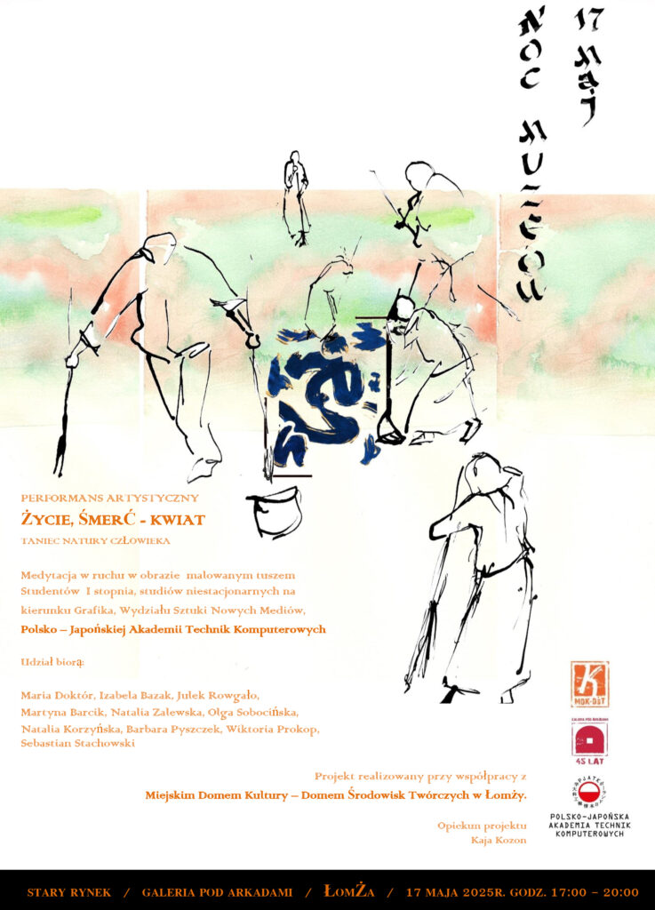 Polsko-Japońska Akademia Technik Komputerowych oraz Miejski Dom Kultury – Dom Środowisk Twórczych w Łomży mają przyjemność zaprosić na performans artystyczny pt. „ŻYCIE, ŚMIERĆ – KWIAT. Taniec natury człowieka”, który odbędzie się 17 maja 2025 roku w godzinach 17:00-20:00 w Galerii Pod Arkadami w Łomży.
