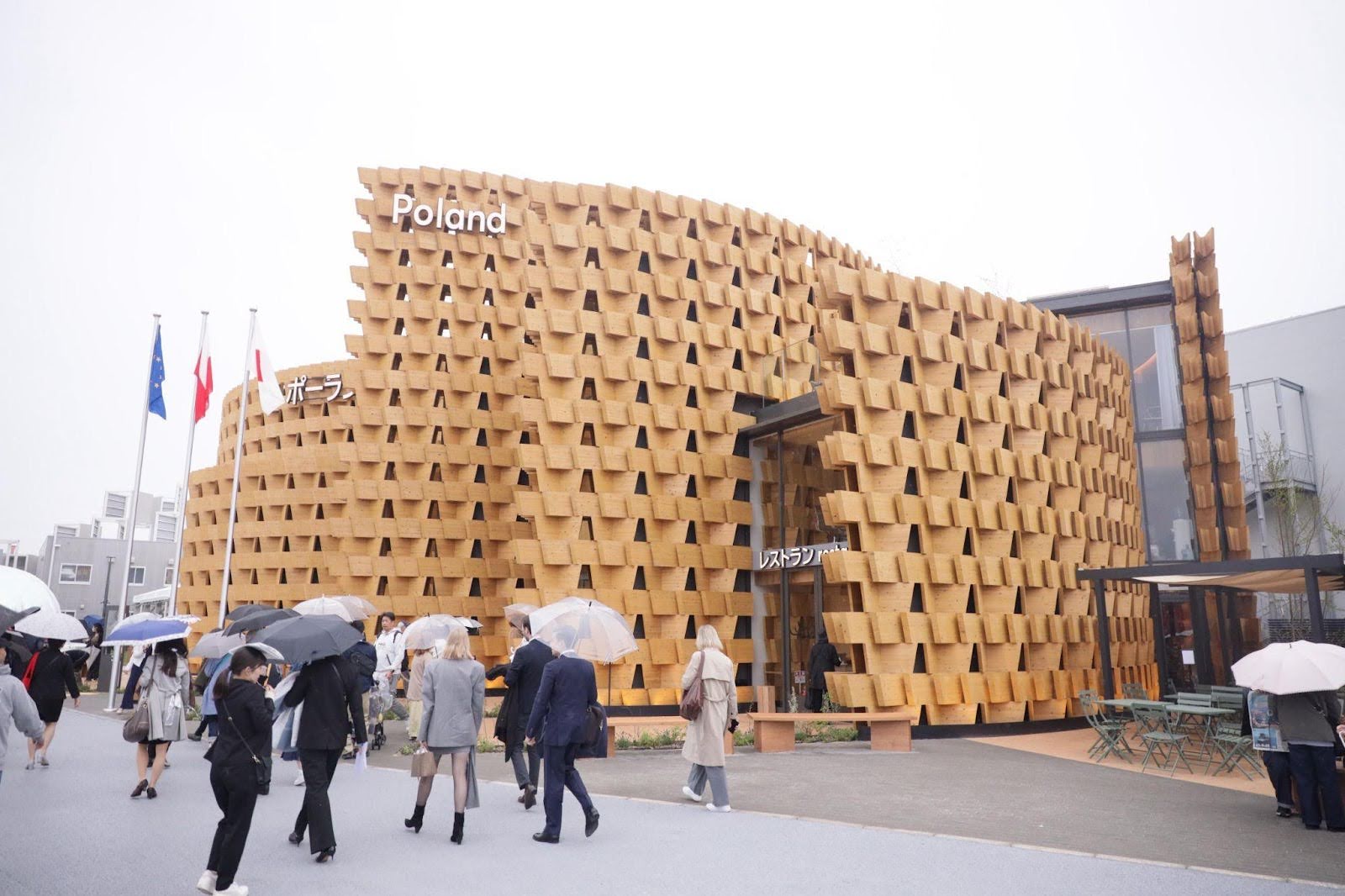 Pawilon Polski, zlokalizowany w strefie „Ratowanie Życia” o powierzchni ok. 1000 m², został zrealizowany w duchu nowoczesności, poprzez wykorzystanie organicznych form drewnianych oraz tradycyjnych technik konstrukcyjnych „Kigumi Koho”. Mottem architektury była „spirala kreatywności”, mająca symbolizować eksport polskiej innowacji i twórczości, a główną postacią narracji był Fryderyk Chopin, którego utwory towarzyszyły zwiedzającym w trakcie cyklicznych koncertów.