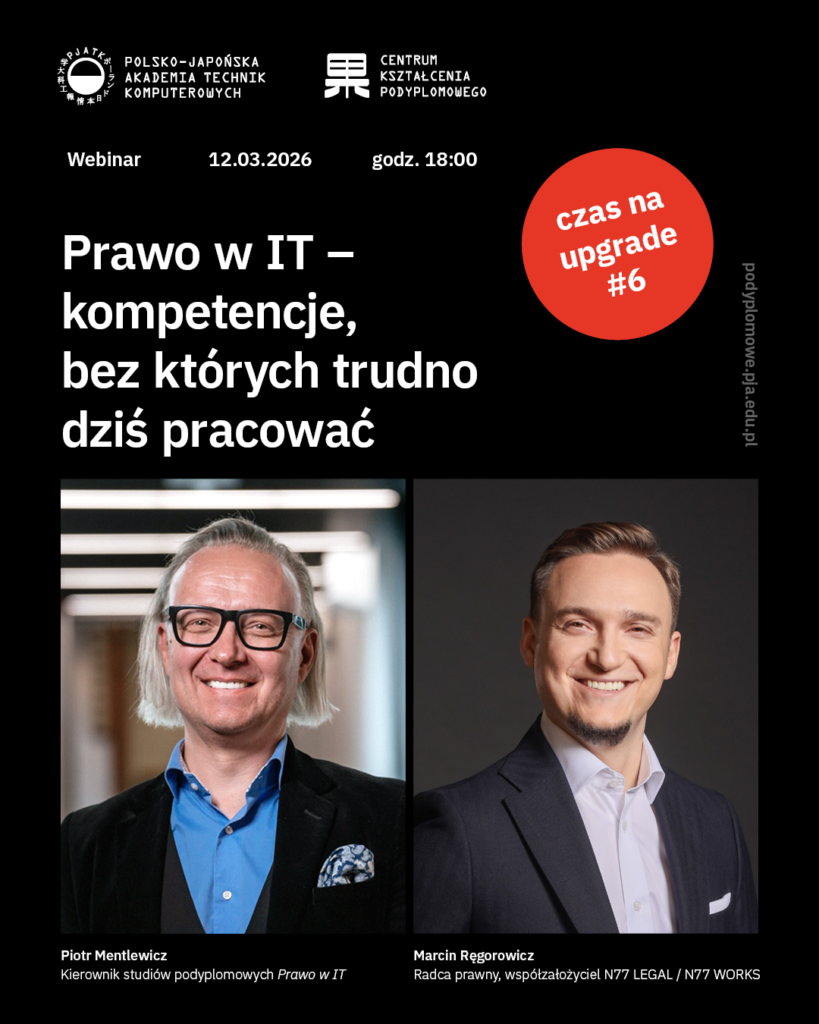 Odpowiedzią na te wyzwania jest wiedza. Dlatego już dziś zapraszamy na kolejny, w ramach cyklu “Czas na upgrade”, bezpłatny webinar „Prawo w IT”, organizowany przez Polsko-Japońską Akademię Technik Komputerowych.