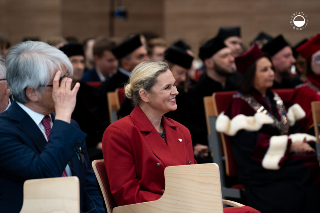 Następnie głos zabrała Ministra Edukacji, Pani Barbara Nowacka, która podkreśliła rangę nowoczesnych technologii w kształceniu. Podkreśliła również wagę wykształcenia wyższego w obecnym świecie, jako elementu potwierdzającego posiadania rozległej wiedzy, którą można wykorzystać do posiadania wpływu na otaczający nas świat, który stale ulega zmianom. Jego Ekscelencja Akiro Kono podkreślił rangę historii Akademii, która ma już 31 lat i jak ważnym elementem jest jej funkcjonowanie dla relacji polsko-japońskich.