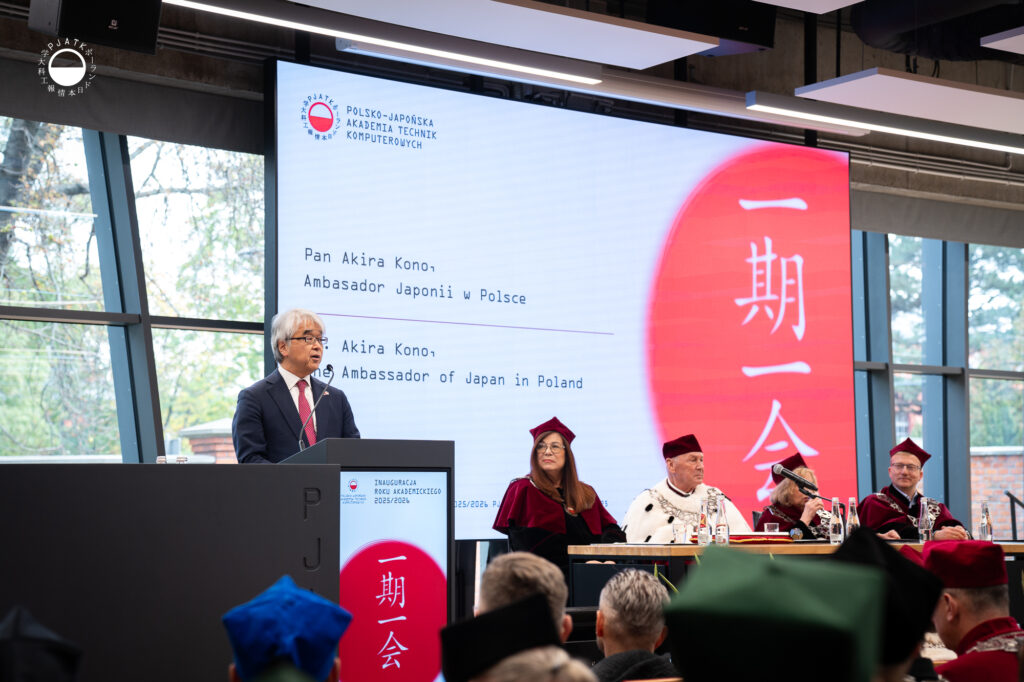 Rektor PJATK, dr hab. Jerzy Paweł Nowacki w swoim przemówieniu przypomniał misję, która przyświeca naszej Uczelni od samego początku – wykształcenie specjalistów w dziedzinie technik komputerowych, prowadzenie badań naukowych w zakresie rozwiązań informatycznych, bez których współczesny świat nie jest możliwy oraz rozwój współpracy między Polską i Japonią.