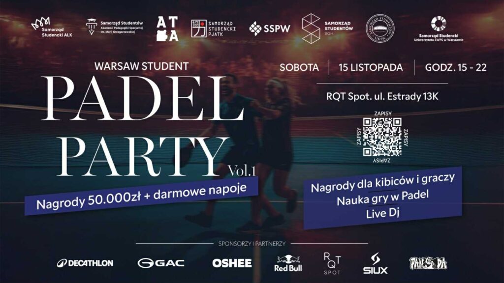8 uczelni. 8 kortów. 0 nudy. Warsaw Student Padel Party to wielki pojedynek, w którym zmierzą się studenci z PJATK, PW, SGH, USWPS, UKSW, ATA, APS i Koźmińskiego. Zabierz znajomego lub znajomą ze studiów, zgłoście się jako duet padlowy i pokażcie, kto naprawdę rządzi na kampusie!