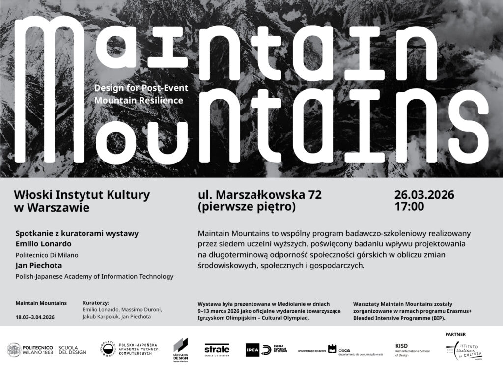 W czwartek (26.03.2026) o godz. 17:00 w Włoskim Instytucie Kultury w Warszawie (ul. Marszałkowska 72) odbędzie się wernisaż wystawy Maintain Mountains. Wystawa jest efektem współpracy profesora Jana Piechoty z PJATK i Politecnico di Milano. Projekt ten jest oficjalną częścią tegorocznych Zimowych igrzysk olimpijskich w Mediolanie.