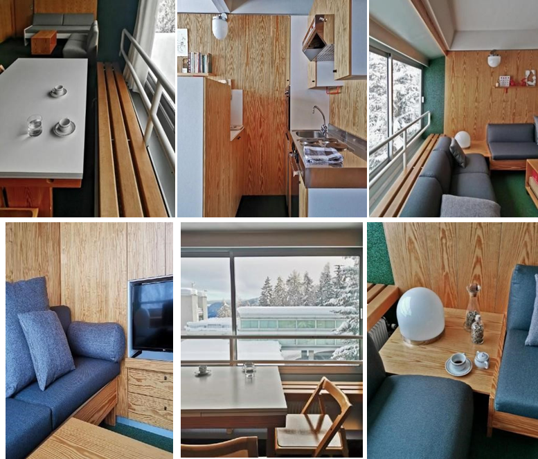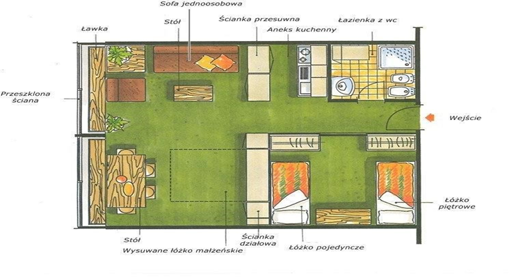 The 5-person BILO apartment consists of a living room with a double sofa bed and a separate area with a bunk bed and a single bed (for a total of 3). It includes a fully equipped kitchenette and a bathroom with a WC and shower. The apartment is divided by a partial wall that offers minimal soundproofing but some privacy. It is a functional yet somewhat openplan space.