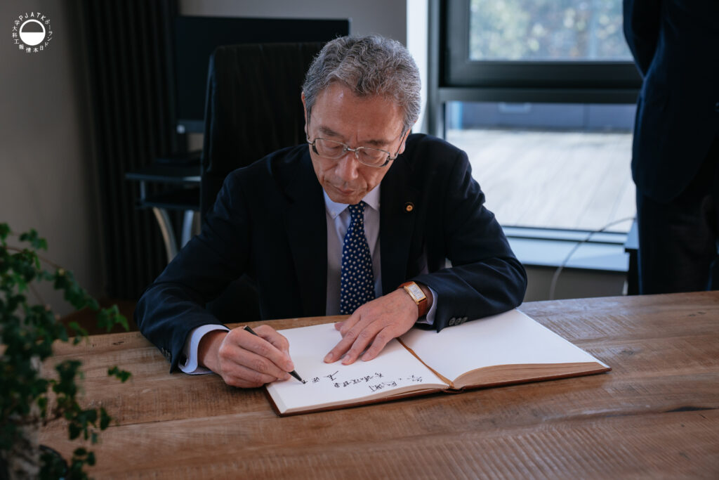 Wizyta rozpoczęła się od kurtuazyjnego spotkania z władzami uczelni, podczas którego Rektor przypomniał, że PJATK powstała 30 lat temu dzięki wsparciu rządu Japonii oraz ekspertów z JICA, podkreślając, że dynamiczny rozwój uczelni świadczy o sukcesie tej inicjatywy. Podziękował także za nieustanną życzliwość ze strony japońskiej, wyrażoną m.in. przez tę wizytę. Podkreślił również istotną rolę Wydziału Kultury Japonii, który nie tylko uczy języka, lecz także przybliża kulturę Japonii, stając się kolejnym symbolem współpracy i przyjaźni między tymi dwoma krajami.