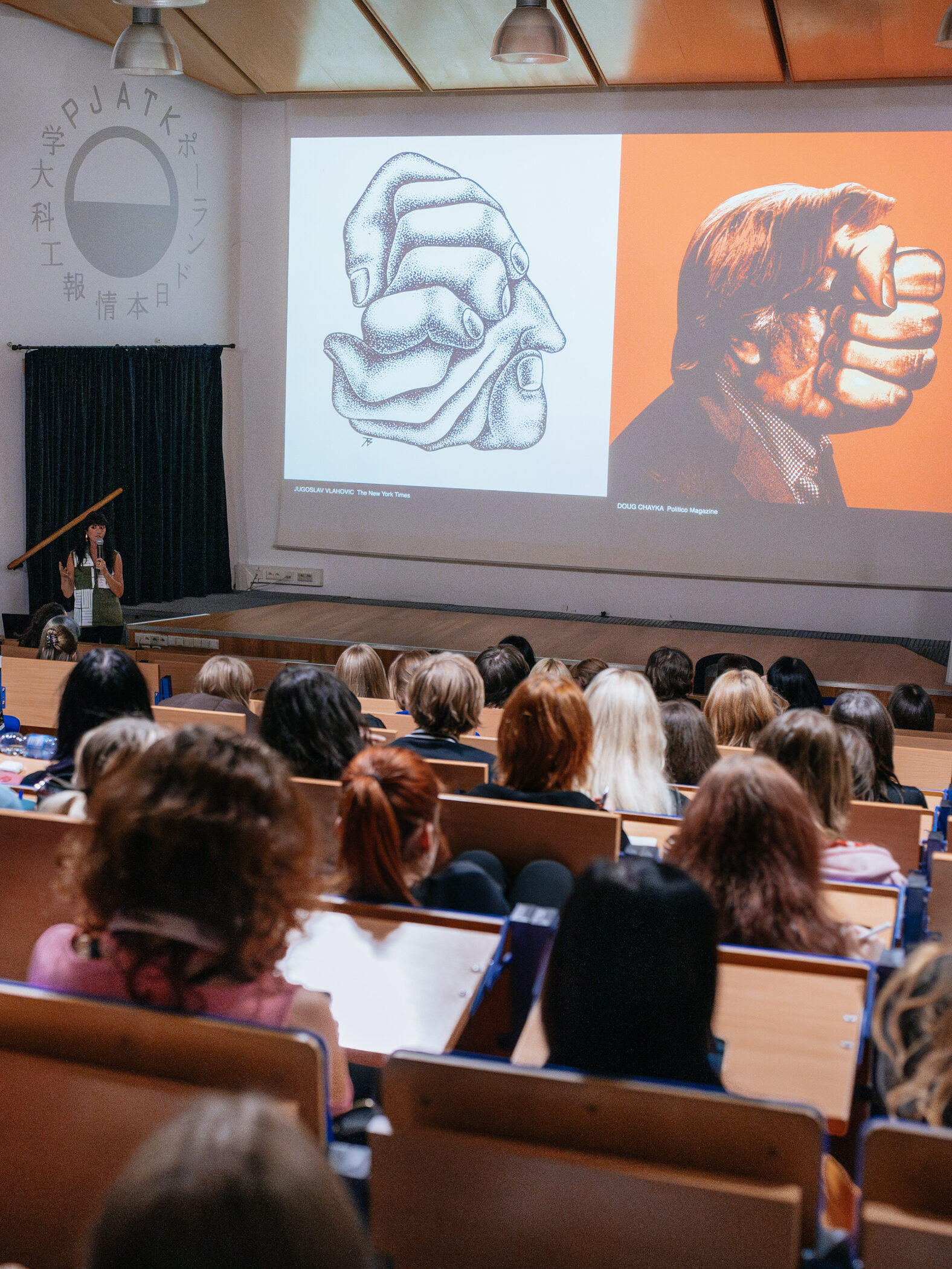 W ramach wykładu słuchacze mieli okazję dowiedzieć się, w jaki sposób ilustratorzy nieustannie na nowo wymyślają wspólny słownik wizualny, aby zaangażować czytelników i rzucić światło na pilne kwestie kulturowe i polityczne. W szczególności przyjrzeli się symbolowi oka, śledząc jego rolę w obrazach redakcyjnych jako symbolu sztucznej inteligencji, inwigilacji i psychologii. Czerpiąc z wieloletniego doświadczenia jako dyrektor artystyczna w The New York Times i The New Yorker, Alexandra podzieliła się kulisami współpracy z ilustratorami, redaktorami i pisarzami, oferując rzadki wgląd w to, jak powstają i są tworzone symboliczne obrazy, które kształtują dyskurs publiczny.