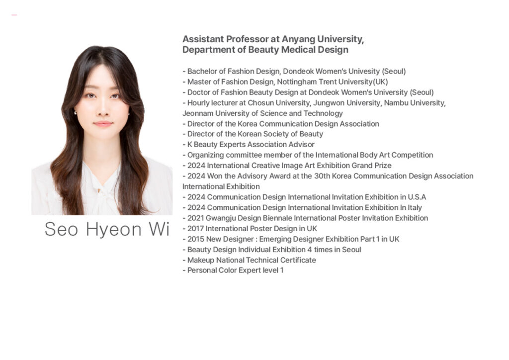 Seo Hyeon Wi, uznana projektantka mody i kreatorka piękna, prezentuje swoją koncepcję „Futurystyczne Piękno”, inspirowaną surrealistycznymi motywami motyli i kwiatów. Jej minimalistyczny styl, połączony z odważnymi kontrastami kolorów i nowoczesnym makijażem, wyraża indywidualność i różnorodność, tworząc wizje pełne marzycielskich i fantastycznych kreacji.