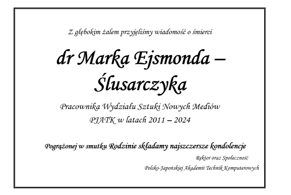 Z głębokim smutkiem zawiadamiamy, że w dniu 3 kwietnia 2024 r. zmarł dr Marek Ejsmond-Ślusarczyk, Pracownik Wydziału Sztuki Nowych Mediów Polsko-Japońskiej Akademii Technik Komputerowych.