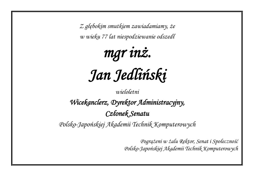 Z głębokim smutkiem zawiadamiamy, że w dniu 9 grudnia 2023 r. zmarł mgr inż. Jan Jedliński, Wicekanclerz, Dyrektor Administracyjny i Członek Senatu Polsko-Japońskiej Akademii Technik Komputerowych.