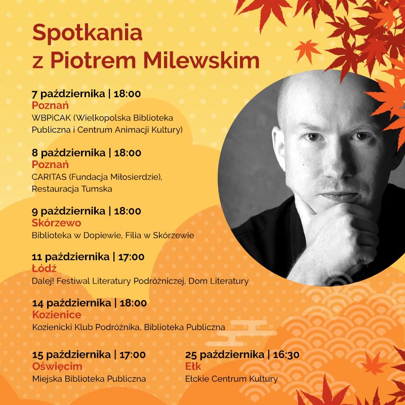 Serdecznie zapraszamy do udziału w nadchodzących w tym miesiącu spotkaniach z Piotrem Milewskim, wykładowcą na Wydziale Kultury Japonii PJATK, cenionym pisarzem i podróżnikem!