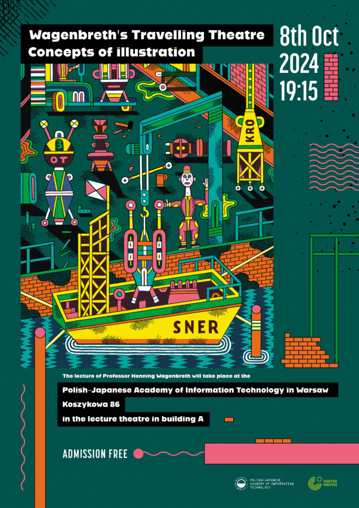 Wykład pod tytułem „Wagenbreth’s Travelling Theatre Concepts of illustration” rozpocznie się o godzinie 19:15 we wtorek 8 października 2024. Spotkajmy się Polsko-Japońskiej Akademii Technik Komputerowych w Warszawie przy ulicy Koszykowej 86 w Warszawie w auli A1 w budynku A.